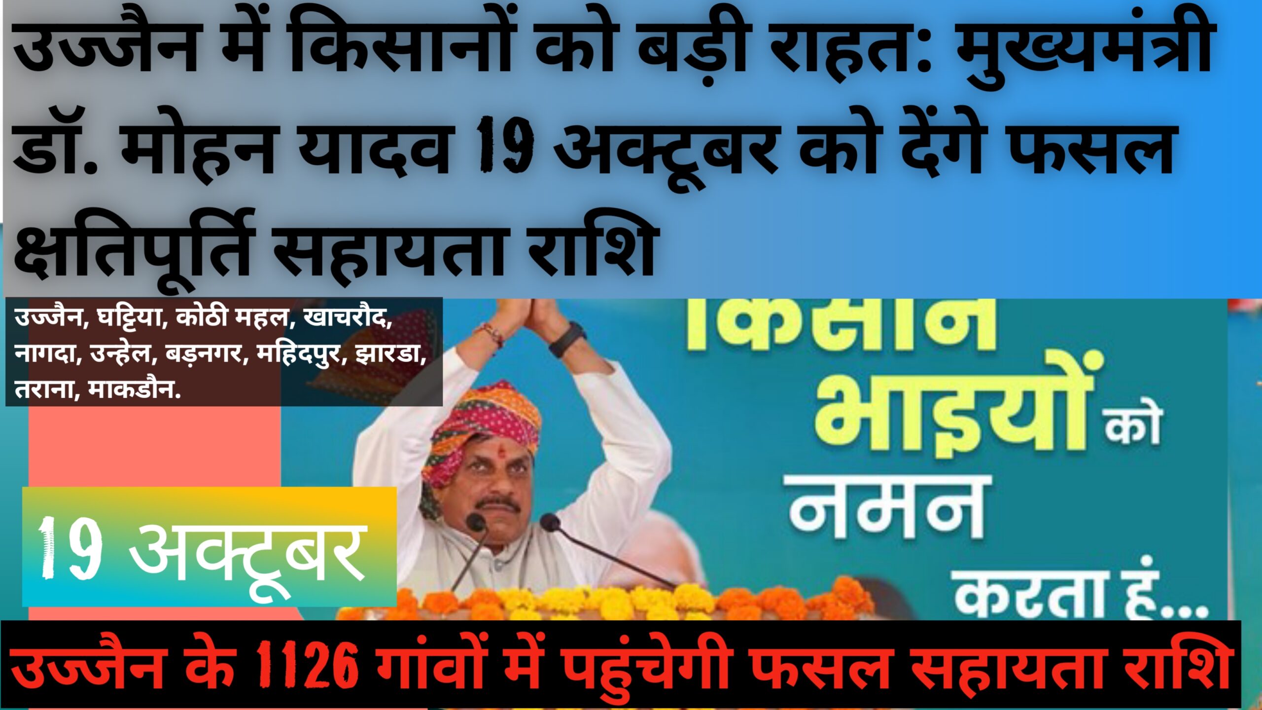 उज्जैन जिले के किसानों के लिए बड़ी राहत। मुख्यमंत्री मोहन यादव 19 अक्टूबर को फसल क्षतिपूर्ति राशि सीधे बैंक खाते में भेजेंगे। जानिए किसे मिलेगी मदद और कितनी राशि।