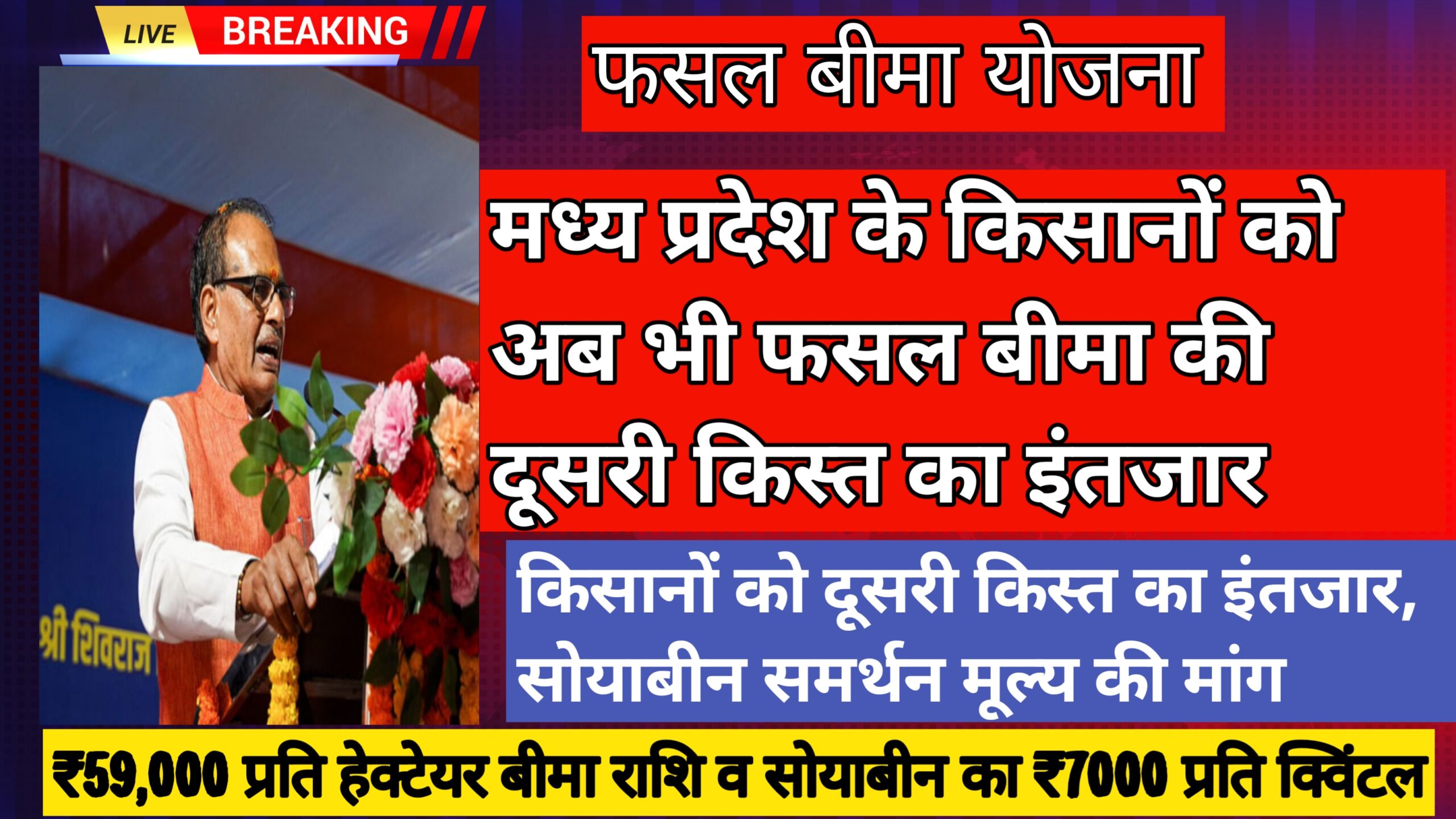 🌾 मध्य प्रदेश के किसानों को फसल बीमा योजना की दूसरी किस्त अब तक नहीं मिली है। प्रदेशभर में किसान प्रदर्शन कर रहे हैं और ₹59,000 प्रति हेक्टेयर बीमा राशि व सोयाबीन का ₹7000 प्रति क्विंटल समर्थन मूल्य मांग रहे हैं।